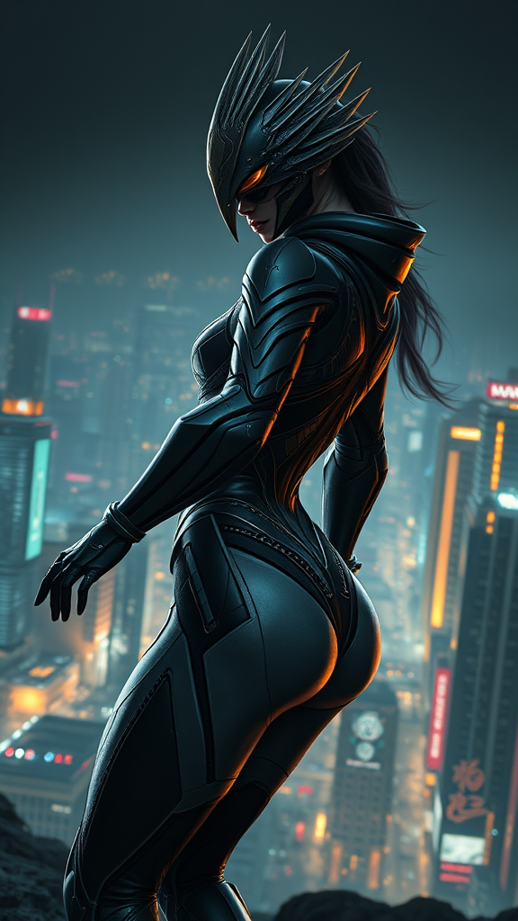 A detailed ornate mask, slender female figure in sleek exo costume, gracefully in motion, captured from a dynamic hip view, set in a sci-fi world. The scene features elements of a hawk and warframe aesthetics, enveloped in a dark, moody atmosphere. Intricate detailing highlights her rogue, agile form clad in battle armor. A sprawling futuristic cityscape serves as the backdrop, radiating with energy lights and neon accents. The image boasts remarkable quality in 8k, showcasing a teflon-like segmented armor with a combination of matte and smooth surfaces. Enhanced by octane rendering, there is an emphasis on realism, with complex volume lighting and 3D ultra-high definition, resulting in a masterpiece of max detail and fine detail.