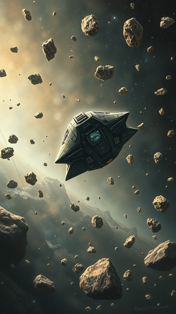 A detailed painting depicts an alien spacecraft skillfully navigating through a dense asteroid field; the small ship's sleek design aids its agile maneuvers to evade looming meteorites. In the vastness of cold, empty space, distant stars twinkle through wisps of ethereal gas clouds, while scattered meteorites add texture to this cosmic tableau, all rendered with the distinctive elegance and mysticism characteristic of BelleDeesse's style.