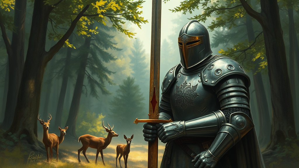 A detailed painting of a knight clad in weathered armor, holding a finely crafted sword, depicted in a subdued color palette with rich dark gold and muted green tones. The knight stands in a forest clearing, surrounded by fawncore elements like gentle deer and dappled sunlight filtering through the trees. The scene captures high detail and character studies, highlighting the utilitarian nature of the knight's gear with textures showing wear from battles. The atmosphere conveys a sense of calm strength, with intricate patterns etched into the armor. The background blends seamlessly into the natural surroundings, using an 8k resolution for crispness, maintaining a vertical composition ratio with an artistic stylization of 750.