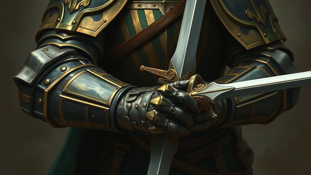 A detailed painting of a knight gripping a sword, featuring a subdued color palette with emphasis on dark gold and emerald green tones. The scene captures the essence of character studies, displaying intricate details in the armor and weaponry, with an 8k resolution that highlights the utilitarian design. The setting evokes a sense of fawncore aesthetics, blending earthy elements with the knight's regal yet functional appearance, under softly stylized touches. The composition is tall and slim, contributing to an air of elegance and mystery.