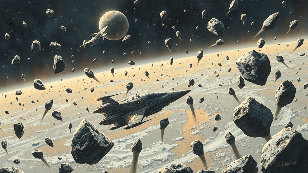 A detailed painting of an alien spacecraft navigating through a dense field of asteroids, with a small, agile spaceship deftly maneuvering to avoid the looming celestial rocks. The backdrop presents a vast, cold, and empty space scattered with meteorites, punctuated by distant stars and intricate gas clouds, rendered in the ethereal and dreamlike style of BelleDeesse, where colors swirl and blend seamlessly, capturing the tension and beauty of the cosmic journey.
