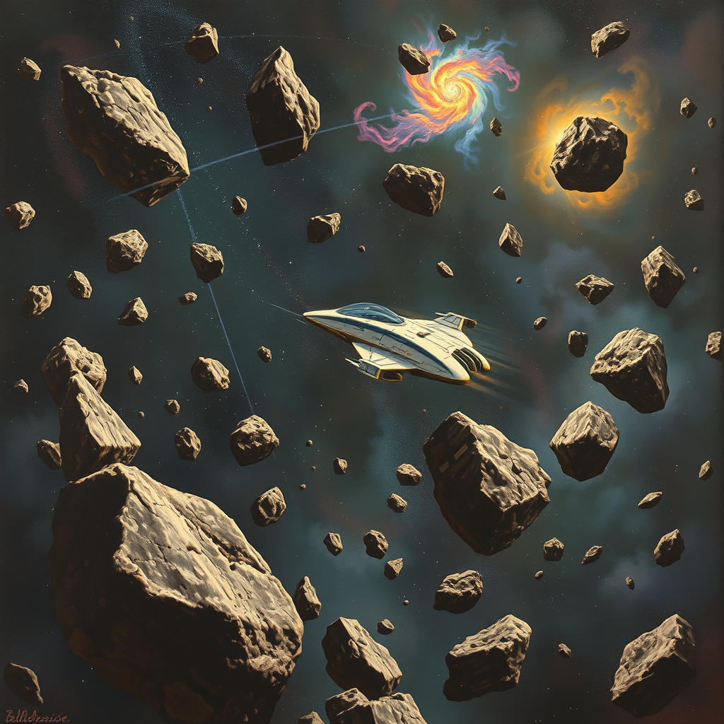 A detailed painting of outer space featuring an elegant alien spacecraft maneuvering skillfully through a dense asteroid field; the small spaceship nimbly dodges massive meteorites against a backdrop of cold, empty space; distant stars twinkle and vibrant gas clouds swirl, capturing the vastness and mystery of the cosmos, all styled with the ethereal and intricate artistry reminiscent of BelleDeesse.