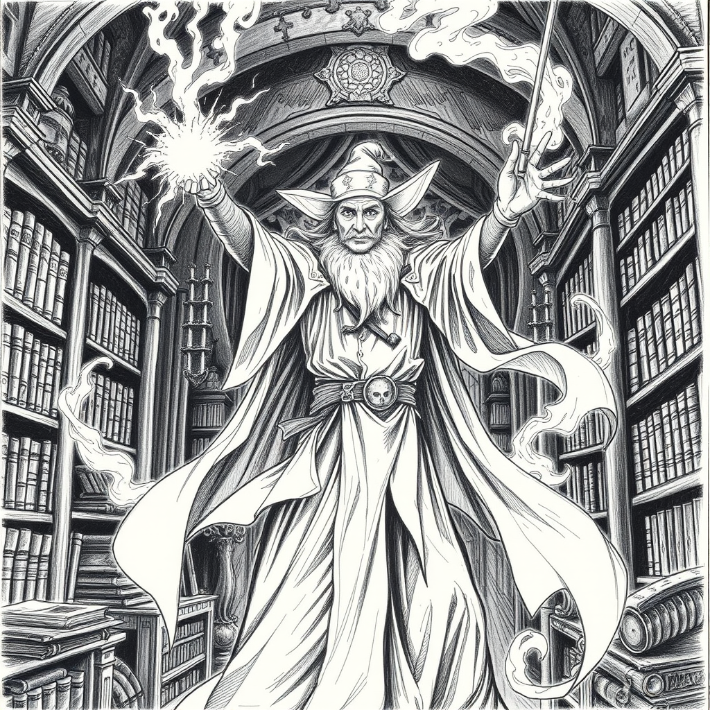 A detailed pencil drawing of a sorcerer casting a spell with his wand in a burst of energy, the wizard's robes flowing dramatically around him, magical sparks and tendrils swirling in the air, conveying a sense of raw power and mystical aura, set against a backdrop of an ancient library filled with arcane tomes and shadowy corners.