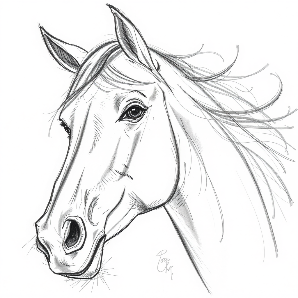 A detailed pencil sketch of a horse, captured through bold and fluid strokes, with expressive facial features. The depiction emphasizes loose, sweeping brushwork and dynamic, calligraphic gestures, presenting a lively and characterful portrait of the animal. The raw energy of the strokes conveys a sense of movement and vitality, maintaining an overall essence of freedom and grace.