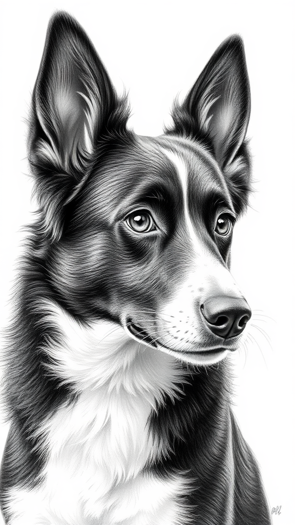 A detailed pencil sketch portrait of a border collie dog, capturing its expressive eyes and intelligent expression, inspired by the style trending on ArtStation. The artwork is presented with sharp focus, reminiscent of a studio photograph, featuring intricate fur texture and fine details. The composition holds a touch of whimsy with slight exaggerations in the dog's playful ears, echoing the masterful touch of Greg Rutkowski.