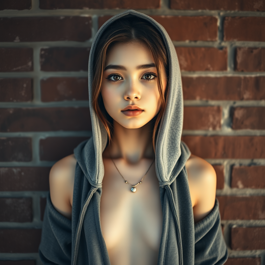 A detailed photograph of a beautiful girl wearing a hoodie, standing against a brick wall. Her attire hints at minimalism as she's without a shirt, captured in hyperdetailed photography with soft lighting that lends a natural glow. The image is sharp-focused and aesthetically appealing, resonating with trending art styles on platforms like ArtStation and Pixiv. Shot in high quality, perhaps 8k UHD with a DSLR, the scene showcases intricate facial details and softness in lighting. However, there's an unusual twist with digitally exaggerated features: elongated neck, asymmetrical eyes, and an overabundance of limbs seeming almost surreal. Elements of digital manipulation like cloned facial features, extended limbs, and disproportionate anatomy add a fantastical essence. Within this creative chaos, the combination of aesthetic allure and bizarre modifications offers a curious balance, featuring imaginative interpretations like a necklace, unusual limb counts, and intriguing details that blur the lines between photography and imaginative artistry.