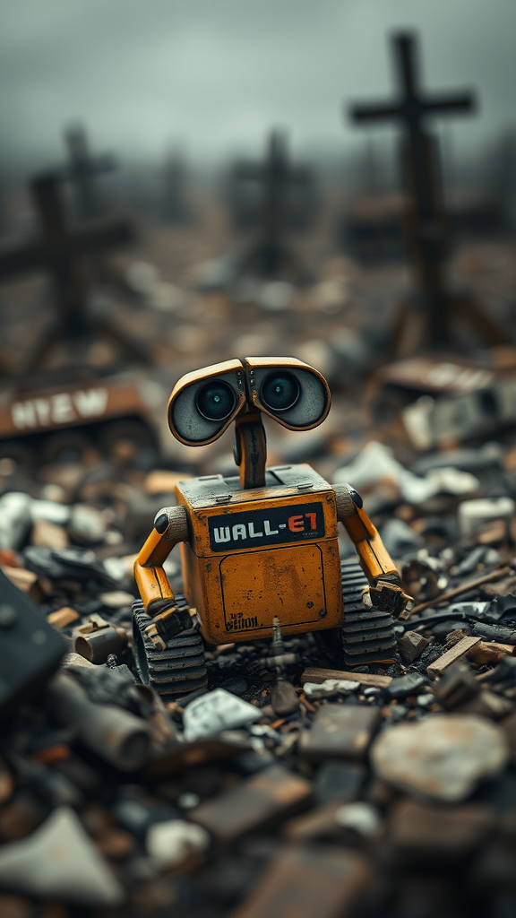 A detailed, photorealistic 3D render capturing a small, adorable mechanical robot reminiscent of Wall-E set against a dramatic World War I battlefield. The scene is styled as an old, award-winning photograph taken with a 50mm film lens, featuring a tilt-shift effect that creates a deep depth of field, surrounded by trash and debris. The wide-angle shot emphasizes the intricate details of the robot and the surrounding environment, with octane-rendered, dramatic lighting that enhances the mood. The image is a provoking composition, blending the historical authenticity of WWI with the charm of the robot in a gritty war-torn landscape, capturing an essence of intricate realism with a bokeh effect in the background.