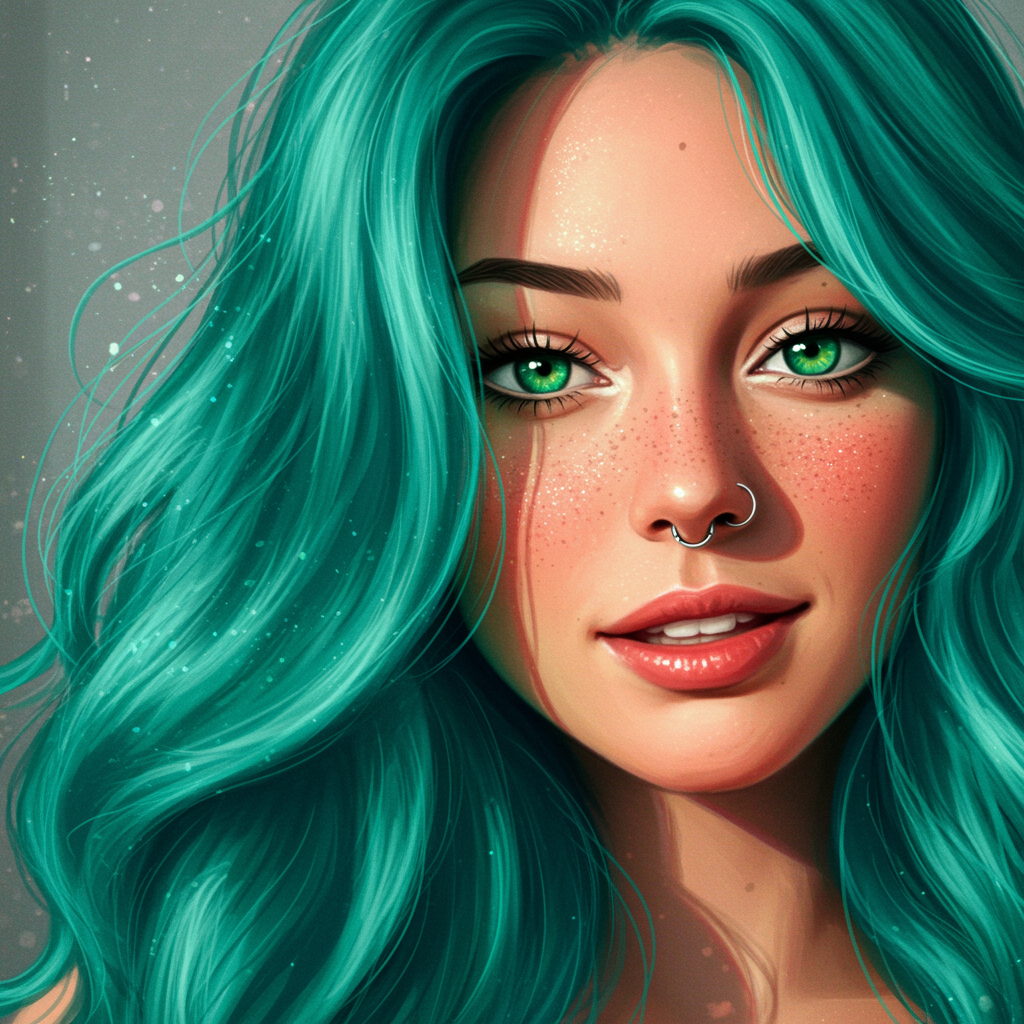 A detailed portrait featuring a woman with stunning turquoise locks cascading around her shoulders, her deep green eyes glowing with intensity. Her skin is luminescent, and she wears a delicate silver nose ring. Subtle freckles sprinkle across her cheeks, adding character to her radiant expression. Soft, ethereal light casts gentle shadows, enhancing the vivid hues of her hair. A hint of a playful smile suggests both mystery and warmth, inviting curiosity about her story.