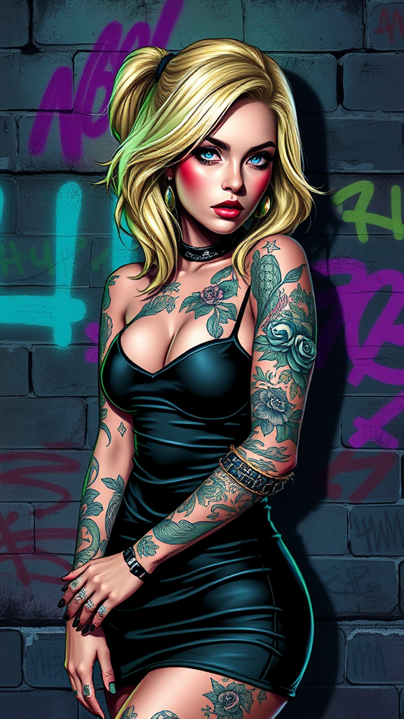 A detailed portrait of a blonde tattooed girl in a mini dress, inspired by the styles of Atey Ghailan, Greg Rutkowski, Greg Tocchini, James Gilleard, Joe Fenton, and Kaethe Butcher. The image features a vibrant gradient color scheme of green, black, purple, and neon hues, set against a grunge aesthetic with a graffiti-tagged nightclub wall background. The artwork captures a dynamic sense of style and attitude, showcasing intricate tattoos and edgy fashion, while emphasizing a night scene ambiance with a modern artistic flair.