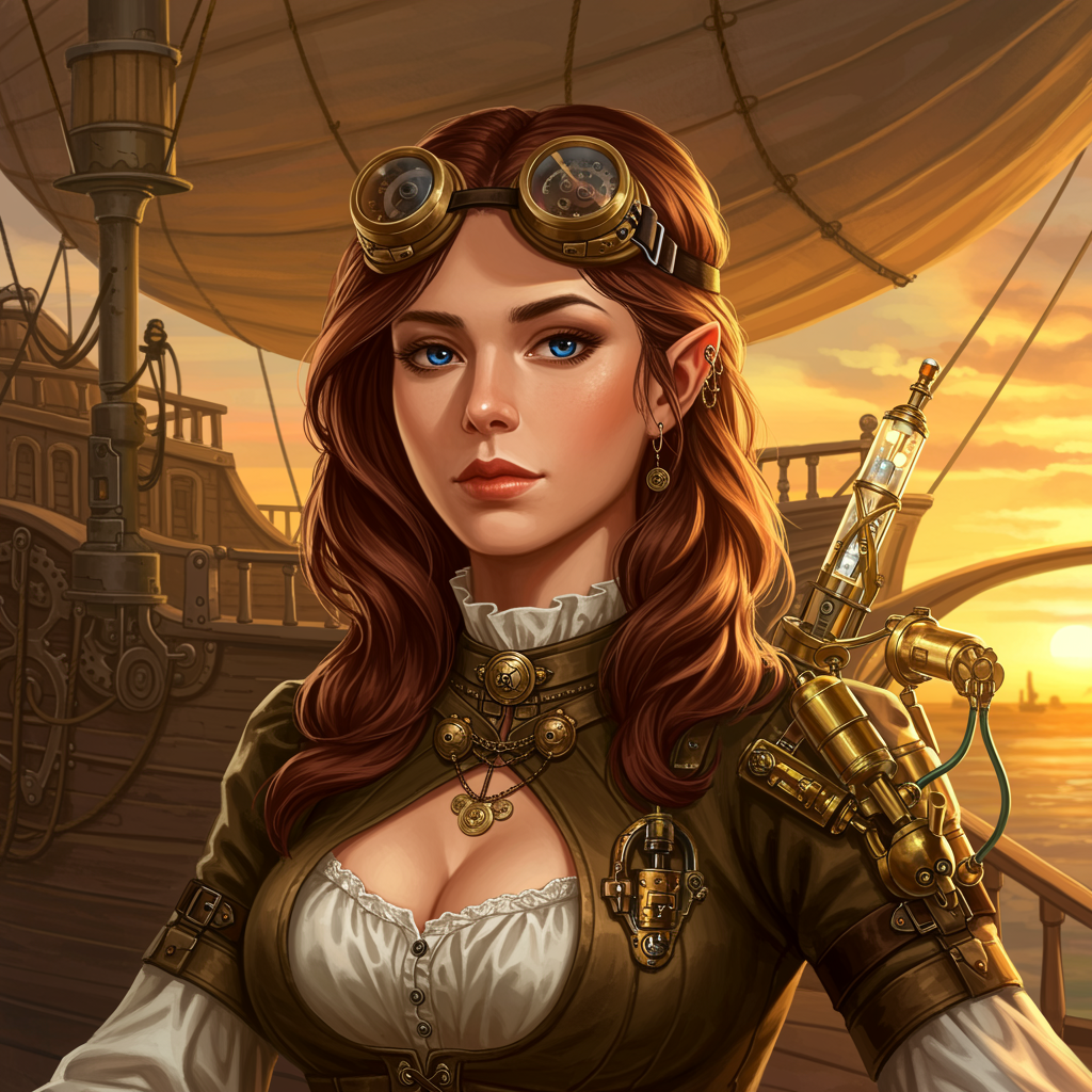 A detailed portrait of a captivating female steampunk inventor set against the backdrop of an airship during sunset. She is adorned in intricate steampunk attire with elaborate goggles resting on her head and a variety of creative mechanical accessories. Her expression is focused and determined, capturing the essence of innovation and adventure. The warm hues of the sunset cast a golden glow on the scene, highlighting the intricate details of her outfit and the airship's architecture. The atmosphere exudes a sense of wonder and exploration, with the futuristic yet vintage elements of steampunk seamlessly integrated into the setting.