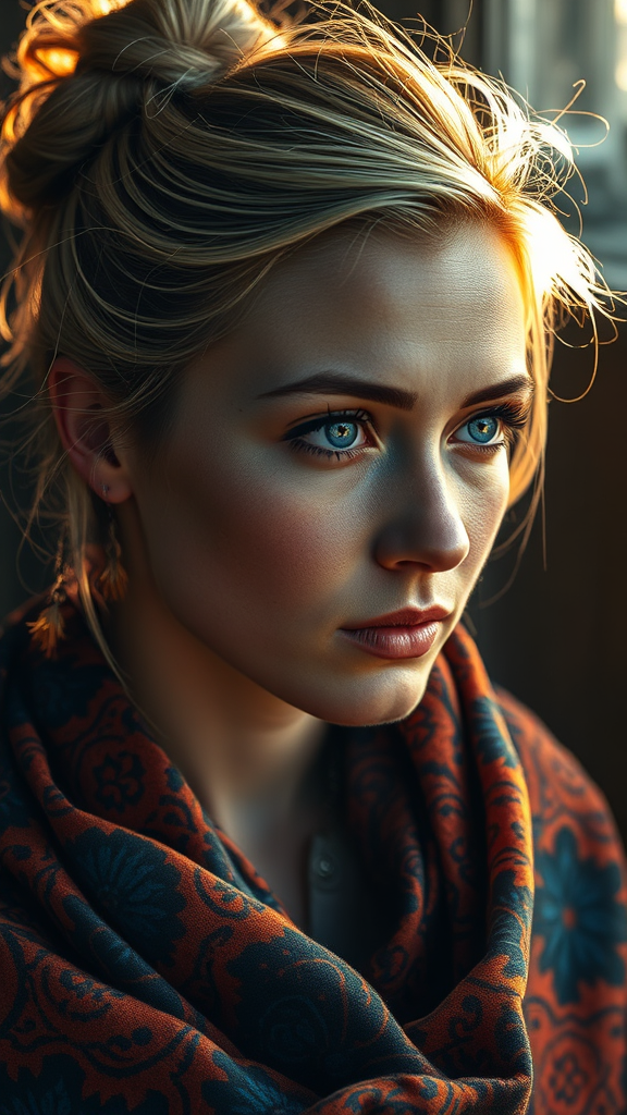A detailed portrait of a captivating Siberian woman deep in thought, her blue eyes reflecting a world of introspection. Her complexion is fair, complemented by a messy bun with subtle blonde highlights in her layered hair. She is adorned in vibrant, newly woven garments featuring a rich tapestry of orange and blue batik patterns, a nod to her cultural roots. A shawl elegantly envelops her shoulders. The rustic backdrop, bathed in warm light, casts a gentle halo around her, enhancing the depth and warmth of her expressive gaze while the play of light and shadow adds a layer of mystique to her presence.