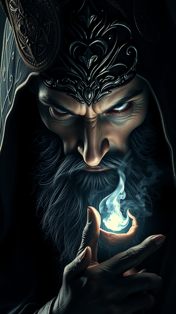 A detailed portrait of a dark sorcerer, exuding an aura of menace and power, intricately designed with ornate patterns and symbols. The composition is masterfully crafted, with volumetric lighting casting dramatic shadows, creating a cinematic atmosphere. The high contrast between light and dark elements highlights the sorcerer's piercing gaze, while the matte painting texture adds depth and richness to the scene. Subtle variations in color evoke a sense of ancient magic and mystery, inviting viewers into a world both enchanting and foreboding.