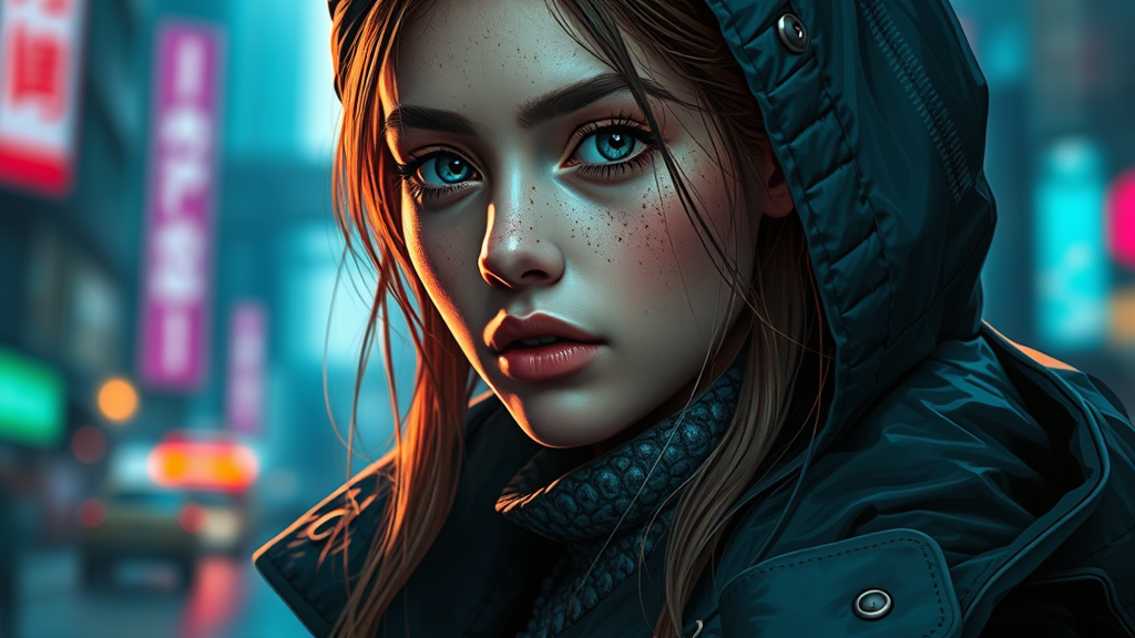 A detailed portrait of a European pretty young girl in a stormy rain movie jacket and coat, blending futuristic sci-fi fashion with royal attire, inspired by artists like Ismail Inceoglu, Dragan Bibin, Hans Thoma, Greg Rutkowski, Alexandros Pyromallis, Nekro, and Rene Magritte. Featuring a perfect face with a sharp chin and fine details, the portrait captures a pretty face with cyberpunk elements, set in a neotokyo, synth-wave aesthetic with low-emission neon colors reminiscent of a Bladerunner movie scene. The art style includes elements of CGI, 3D, and cartoon influences, showcasing a realistic shaded illustration with digital painting techniques, highlighting fine details. The image embraces a futuristic vision with sci-fi undertones, focusing on dynamic composition and intricate artwork, avoiding negative aspects such as poor anatomy or deformed features. The overall look is polished, capturing an elegant and regal futuristic fashion statement.