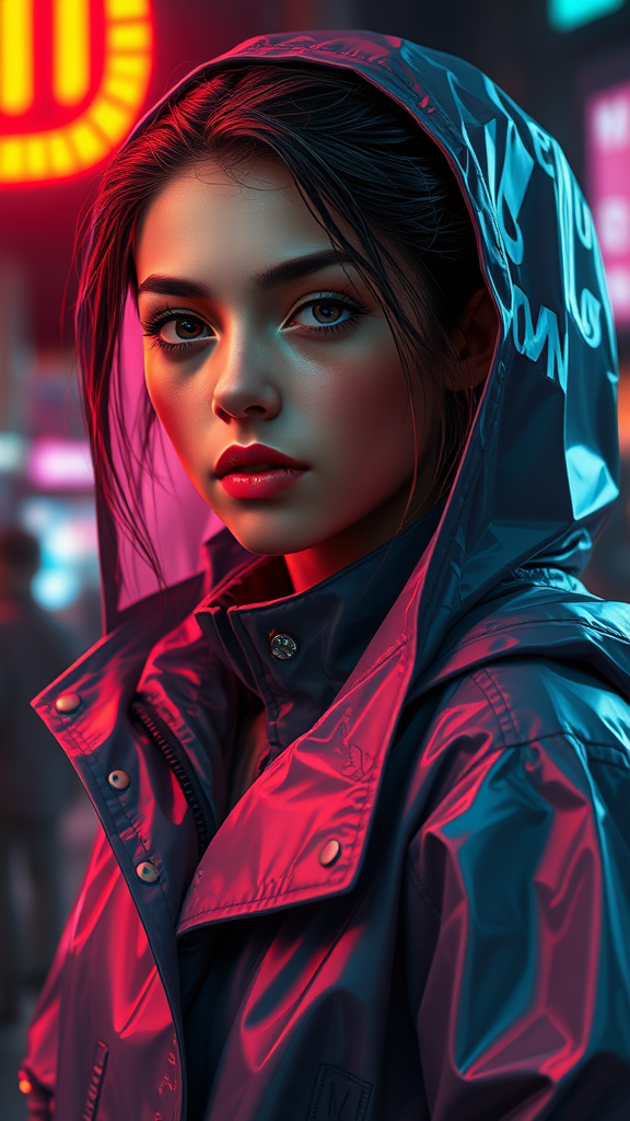 A detailed portrait of a European Pretty Young Girl wearing a futuristic sci-fi raincoat inspired by a movie jacket, blending royal attire elements. The style draws influence from Ismail Inceoglu, Dragan Bibin, and Hans Thoma, with touches of Greg Rutkowski and Alexandros Pyromallis. The scene embodies cyberpunk and neotokyo aesthetics, reminiscent of a Bladerunner movie, with dramatic low-emission neon lighting. The portrait captures a perfect face with a sharp chin, fine details, and realistic shading, reflecting cyberpunk synth-wave aesthetics. The image is a high-resolution, hyper-realistic CGI artwork, with rich colors and lifelike textures, resembling an ultra-high-definition photograph taken with an f1.6 lens. The girl's expression is lifelike yet somewhat ethereal, surrounded by an atmospheric blend of royal and sci-fi elements, rendered in high detail with a focus on realism and hyper-realism.