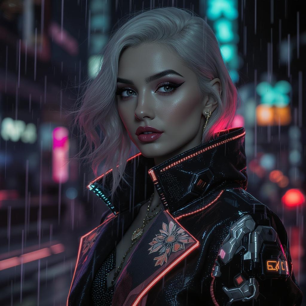 A detailed portrait of a European pretty young girl wearing a storm rain movie jacket coat, showcasing futuristic sci-fi fashion with hints of royal attire, influenced by artists like Ismail Inceoglu, Dragan Bibin, Hans Thoma, Greg Rutkowski, Alexandros Pyromallis, Nekro, and Rene Magritte. The girl has a perfect face with a sharp chin and fine details, exhibiting realistic shading and a charming appearance. Her style embodies cyberpunk, neotokyo, and synthwave aesthetics, with a low-emission neon glow reminiscent of a Blade Runner movie scene, infused with unique, creative elements for a striking visual impact.