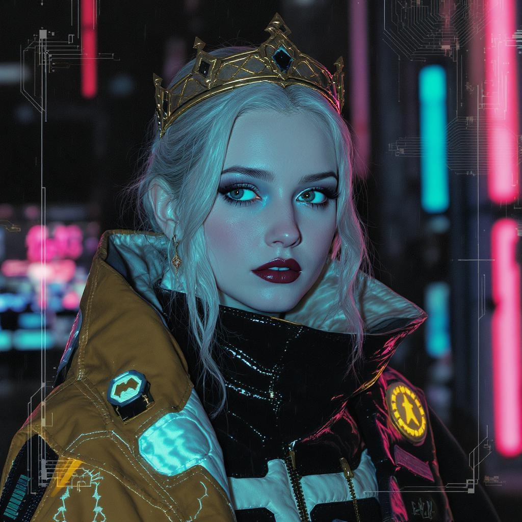 A detailed portrait of a European pretty young girl wearing a movie-inspired storm rain jacket coat, blending futuristic sci-fi fashion with royal attire. The design is influenced by the styles of Ismail Inceoglu, Dragan Bibin, Hans Thoma, Greg Rutkowski, and Alexandros Pyromallis. Her face is perfectly illustrated with sharp chin and fine details, showcasing a realistic yet idealized appearance. The aesthetic combines cyberpunk and neotokyo elements with a synthwave vibe, set in a low-emission-neon ambiance reminiscent of a Blade Runner movie scene. The attire and background incorporate subtle nods to the surreal artistry of Rene Magritte and the edgy style of Nekro, resulting in a unique and imaginative portrayal of elegance and futurism.