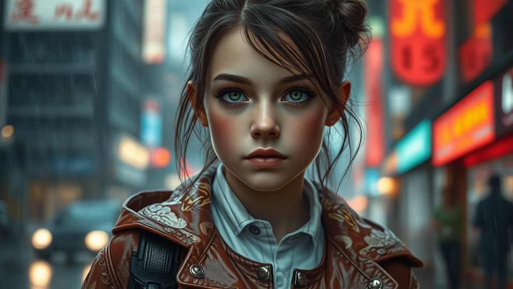 A detailed portrait of a European young girl in a stormy rain setting, wearing a movie-inspired jacket and coat with futuristic sci-fi fashion elements, reminiscent of royal attire. The artistic styles of Ismail Inceoglu, Dragan Bibin, Hans Thoma, Greg Rutkowski, Alexandros Pyromallis, and Rene Magritte influence the composition, featuring a perfect face with sharp features, realistic shading, and a pretty, fine face. Set in a cyberpunk, neo-Tokyo environment with synth-wave aesthetics and low-emission neon, evoking a Blade Runner movie scene. The portrait demonstrates dramatic lighting, high detail, and a RAW color palette, presenting a professional, realistic photo with ultra-high resolution in 8K. The work boasts highly detailed CGI and physics-based rendering, showcasing hyper-realistic texture with rich colors captured through an f1.6 lens. The piece blends elements of realism and hyper-realism within a photographic and illustrative framework, ensuring lifelike precision.