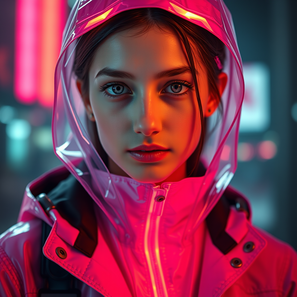 A detailed portrait of a European young girl wearing a futuristic, sci-fi-inspired rain jacket, reminiscent of a royal attire. The jacket is a blend of cyberpunk and synth-wave aesthetics, capturing the essence of a Bladerunner movie scene with its low-emission-neon glow. Her face is perfect and finely detailed, with sharp features and realistic shading. The dramatic lighting enhances her pretty, fine features, evoking a sense of neotokyo allure. The image is highly detailed, resembling an 8K resolution, physics-based rendering. It's a hyper-realistic portrayal with rich colors and textures, capturing a lifelike essence. The cinematic quality is akin to a professional photo taken with an f1.6 lens, showcasing vivid, deep colors. There are no unwanted anomalies; the girl's anatomy is flawless, with no imperfections on her skin. The portrait avoids any elements such as logos or text, focusing solely on the artistic representation. The overall composition maintains elegance, channeling influences from artists like Ismail Inceoglu, Dragan Bibin, Hans Thoma, Greg Rutkowski, and others, resulting in a visually striking and imaginative scene.