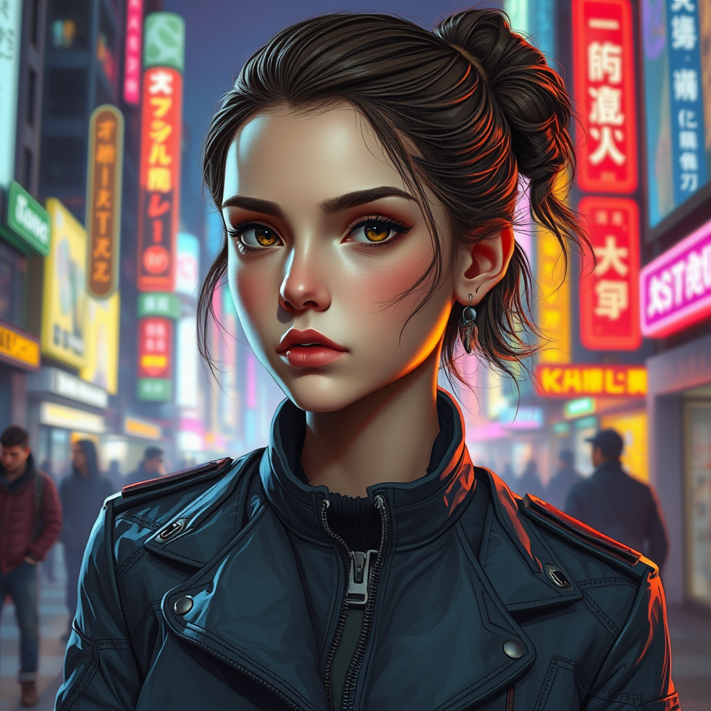 A detailed portrait of a European young girl wearing a movie-inspired jacket with futuristic sci-fi fashion elements, reminiscent of royal attire. The artwork blends the styles of artists like Ismail Inceoglu, Dragan Bibin, and Rene Magritte, featuring a perfect face with a sharp chin, using realistic shading. The character is set in a cyberpunk, neon-lit city reminiscent of a Blade Runner movie scene, emphasizing synth-wave aesthetics and low-emission neon lights. The image is a digital painting with fine details that capture a blend of a doll-like and anime-inspired style. Avoid elements like text, logos, or any distortions such as blurry features, unnatural anatomy, or missing limbs. The artwork should focus on creating a cohesive and visually appealing composition, highlighting the subject's futuristic attire within a vibrant, atmospheric setting.