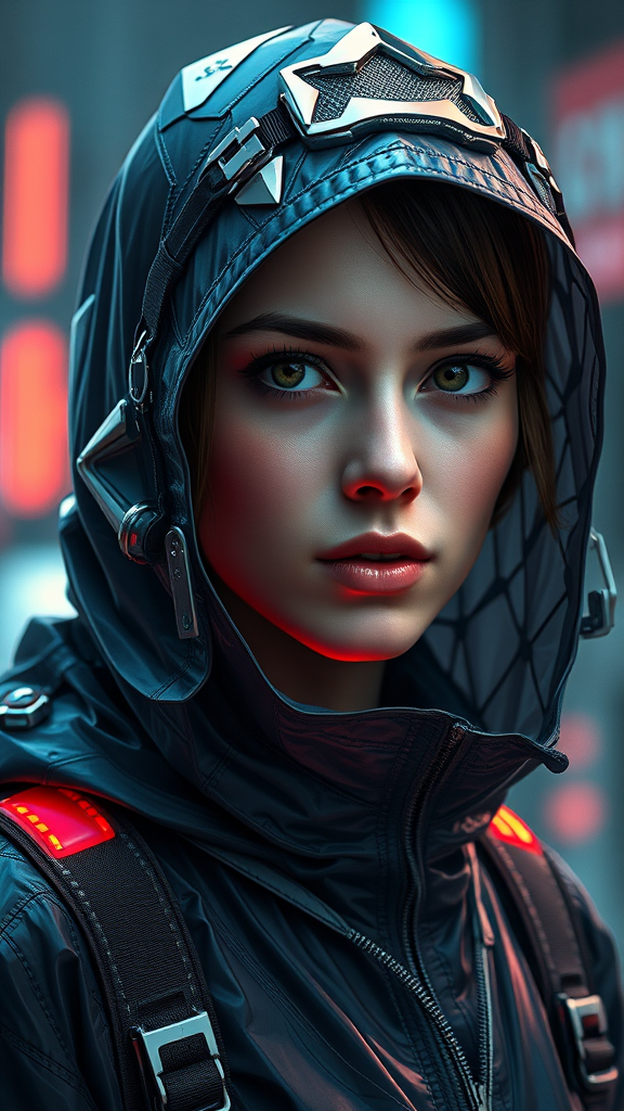 A detailed portrait of a European young woman wearing a stylish storm rain jacket blended with futuristic sci-fi fashion, conveying a royal aesthetic. Inspired by the works of Ismail Inceoglu, Dragan Bibin, Hans Thoma, Greg Rutkowski, Alexandros Pyromallis, and Rene Magritte. The composition features a perfectly sculpted face with sharp features and fine details, highlighted by dramatic lighting reminiscent of a Blade Runner movie scene. The jacket is a fusion of cyberpunk, Neo-Tokyo, and synth-wave aesthetics, adorned with low-emission neon elements, showcasing futuristic and high-contrast visuals. Captured as a high-detail RAW color photo with rich, hyper-realistic textures, presented in ultra-high resolution. This striking image blends CGI, 3D, digital art, and photography, offering a lifelike portrayal with rich colors and hyper-realistic lifelike textures, resembling a cinematically styled scene photographed with an f1.6 lens. The character's attire incorporates a blend of modern and royal elements, merging past and future in a seamless cyberpunk vision.