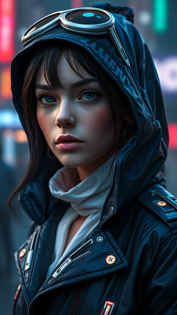 A detailed portrait of a European young woman wearing a storm rain movie jacket coat that blends futuristic sci-fi fashion with royal attire, inspired by the styles of Ismail Inceoglu, Dragan Bibin, Hans Thoma, Greg Rutkowski, Alexandros Pyromallis, Nekro, and Rene Magritte. She has a perfect face with a sharp chin and fine details, set against a backdrop of cyberpunk, neotokyo, and synth-wave aesthetics reminiscent of a Bladerunner movie scene. The attire features low-emission neon accents with dramatic lighting, captured in high detail. The portrait is a high-resolution, ultra-detailed CG image, rendered in 8K, showcasing a harmonious blend of realistic textures and vibrant colors. The use of physics-based rendering, with a focus on hyperrealism and rich lifelike textures, gives the image a photographic quality, enhanced by a f1.6 lens effect. The overall composition balances realism with digital artistry, resulting in a visually striking depiction without imperfections or distortions.