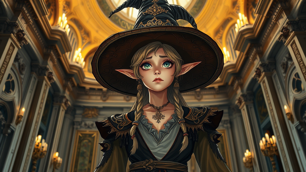 A detailed portrait of a female elf wizard standing in a grand palace, exuding a disappointed expression. She's adorned with an oversized, intricate hat and wears long, tattered robes that hint at a seductive charm. The perspective is from below, enhancing the regal yet somber aura. The scene boasts a cartoon-like, Victorian fantasy aesthetic, illuminated by complex lighting that highlights every detail with absurd resolution. The composition is coherent and polished, ensuring a surreal yet dreamlike quality to the wizard's presence.