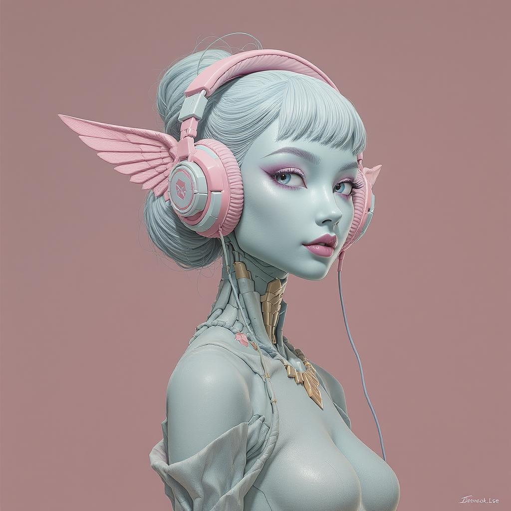 A detailed portrait of a figure with winged headphones, featuring a surreal sculpture design in pastel colors, inspired by Jeonseok Lee. The image showcases photorealism with modernist headphones, embodying a Korean Audrey Hepburn automaton style. The figure dons 2020 fashion inspired by game character headphone designs, offering a full body and head view. Influenced by Sascha Schneider, the character sports an animal-style head with a realistic cartoon aesthetic. The airbrushed finish gives a mind-bending effect, blending a hybrid human/tank essence, accented with a unique hairband.