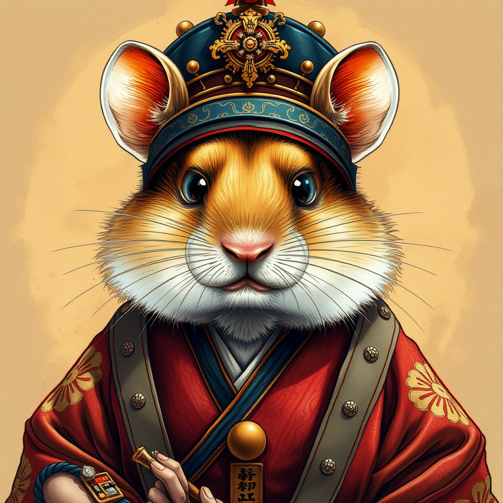 A detailed portrait of a hamster dressed as a feudal Japanese emperor, centered and key visual, showcasing intricate and breathtaking beauty with precise lineart. Inspired by the vibrant and cinematic styles of Carne Griffiths and Conrad Roset, the portrait combines rich textures and colors, capturing the majesty and elegance of an emperor in a charming, whimsical manner. The portrayal is highly detailed, emphasizing the hamster's regal attire and expression, ensuring a sense of wonder and admiration. The artwork maintains clarity and focus, avoiding any distortions, errors, or unnecessary elements, thereby preserving the character's authenticity and charm.
