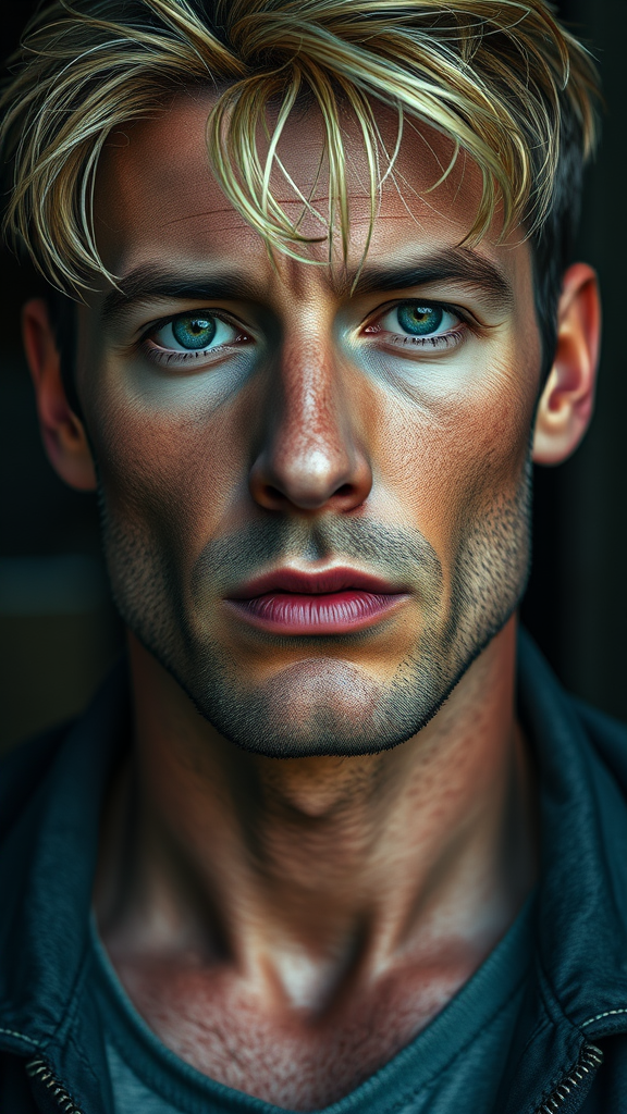 A detailed portrait of a man featuring a close-up view, showcasing his dark blond hair and prominent nose, his expression is serious and clean-shaven. The artwork captures him wearing clothing, focusing on his upper body and shoulders, rendered in 8k resolution. Inspired by dmc_kay and WLOP, the piece employs dynamic and volumetric lighting to enhance the intricate details of his face, creating a hyper-detailed and intricately textured image. The composition is brought to life with a triadic color scheme and a splash of creativity, making it a captivating piece of trending art.