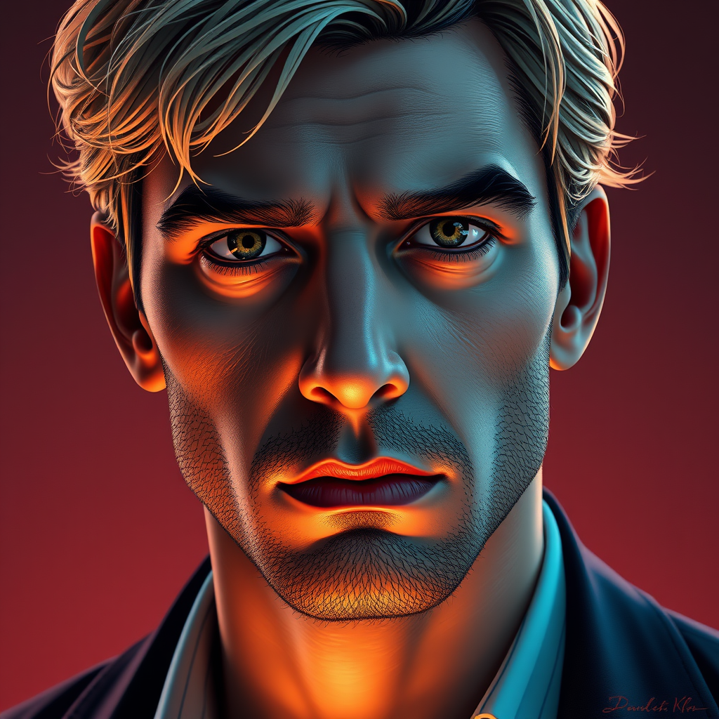 A detailed portrait of a man with dark blond hair and a prominent nose, clean-shaven with intricate facial details. The expression is serious, capturing the upper body, head, and shoulders in a close-up view. The man is dressed in stylish attire. The artwork is rendered in 8k resolution with a concept art style by dmc_kay and WLOP, featuring dynamic and volumetric lighting. The piece is hyper-detailed with an intricately crafted splash effect, trending in art circles, and utilizes a vivid triadic color scheme. Subtle creative elements enhance the depth and intensity of the image.