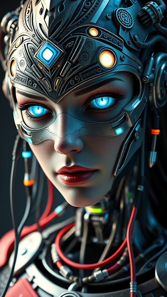 A detailed portrait of a mechanical Supergirl featuring a highly intricate face with global illumination and realistic shadows. Rendered in octane with an 8K ultra-sharp finish, the metal components are adorned with intricate ornaments and cold colors, drawing inspiration from Egyptian details. The piece highlights realistic lighting and is trending on CGSociety. Her eyes glow with neon details, and she gazes directly at the camera. Mechanical limbs are shown, with visible blood vessels connected to tubes and a mechanical cervical structure attached to her neck. Wires and cables interlace with her head, adding to the complexity. The portrayal maintains high-quality rendering, capturing the essence of the mechanical theme while ensuring anatomical accuracy and pristine image quality.