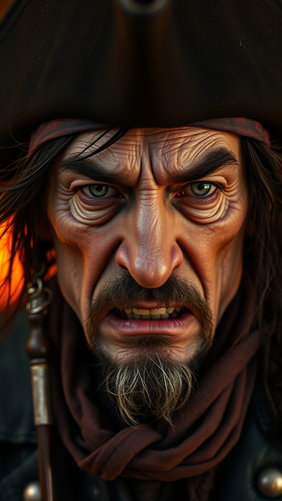 A detailed portrait of a pirate, capturing a half-body shot of an intimidating figure with an ugly, scary face deeply etched with wrinkles emerging from the corners of the mouth and cheeks. The pirate has messy, dark, greasy hair, styled in a realistic disheveled manner, and is adorned with a deformed black felt pirate hat. The attire includes a winter-intricate leather coat, adding to the mysterious aura. The pirate is staring directly at the camera with a gloomy expression, set against a centered composition in promotional art style. The image is highly detailed and intricately sharp focused, with inspiration drawn from Alessandro Casagrande, Greg Rutkowski, and Sally Mann. The lighting is cozy and indoor, diffused yet enhanced by magical sunset tones, softening the cinematic feel. Captured with an 85mm lens at f/1.8, this medium shot includes volumetric fog for added depth, trending on platforms like Tumblr. The image boasts HDR quality, resembling photorealism with ultra-detailed elements, akin to octane render, exemplifying magical and dramatic portrait photography.