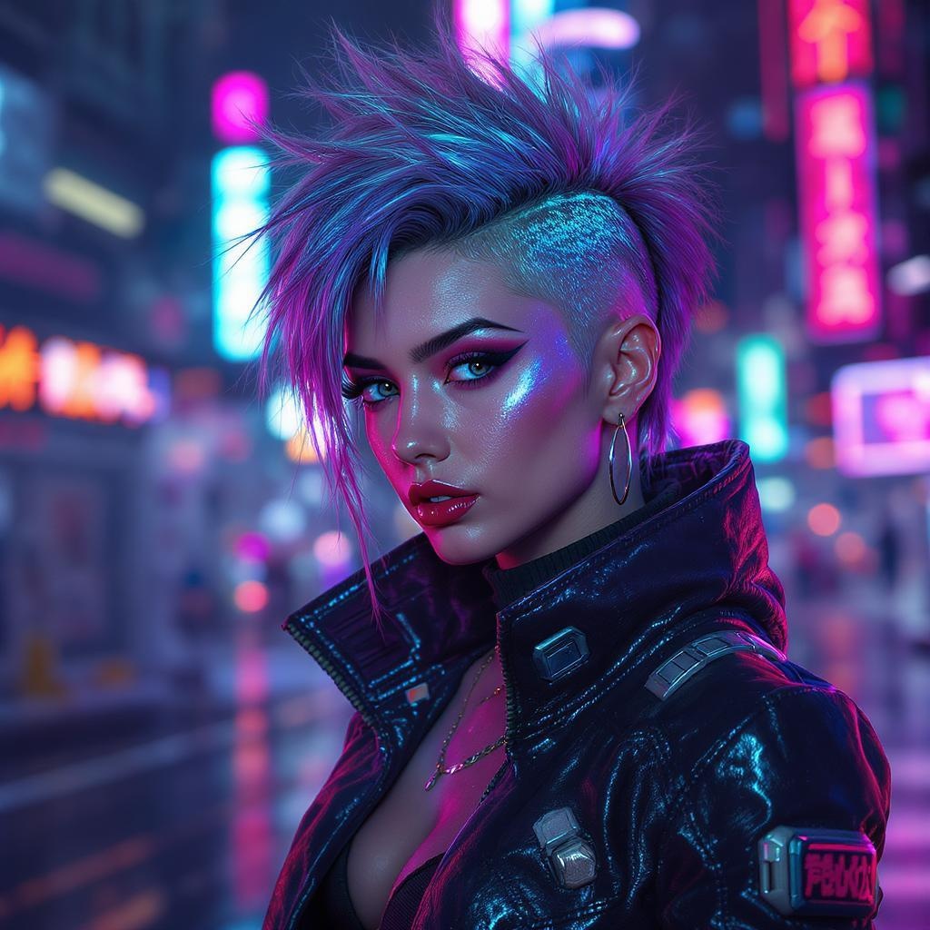 A detailed portrait of a punk girl with a unique standing hairstyle that has a sheen holographic effect, dressed in futuristic sci-fi fashion with cyberpunk elements. The scene exudes a synthwave vibe reminiscent of a Blade Runner movie, drawing inspiration from artists like Ismail Inceoglu, Dragan Bibin, and Greg Rutkowski. Her face is perfect and finely detailed, with realistic shading and sharp features. There's a striking contrast between her futuristic attire and the vivid, neon-lit backdrop. Despite the edgy style, her expression is captivating and intriguing. The atmosphere is imbued with a blend of surrealism and realism, creating a visually striking image without any flaws or distortions. The composition is coherent and seamless, embodying a vibrant yet polished aesthetic.