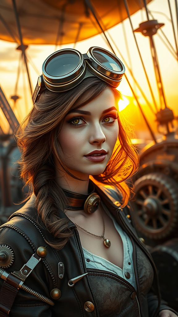 A detailed portrait of a stunning female steampunk inventor, surrounded by the intricate machinery of an airship at sunset. She exudes intelligence and creativity, with steampunk goggles resting atop her head, her hair elegantly styled. The golden light of the setting sun bathes the scene in warmth, reflecting off her brass and leather attire, a testament to her inventive spirit. Her eyes are filled with determination and curiosity, and her surroundings are filled with gears and blueprints, hinting at her latest innovations. The airship's intricate design is a backdrop to her poised presence, embodying the adventurous essence of the steampunk genre.