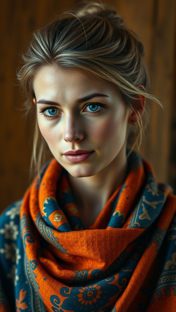 A detailed portrait of a stunning Siberian woman, her introspective expression revealing deep blue eyes and a fair complexion. Her hair, styled in a messy bun with subtle blonde highlights, complements her layered attire. She is adorned in a newly crafted orange and blue batik garment, enriched with intricate textures that celebrate her cultural heritage. A warm, rustic background envelops her, as soft light forms a gentle halo around her, enhancing the depth of her thoughtful gaze and the ambiance of the scene. Her shawl, draped elegantly, adds a touch of grace, integrating seamlessly into the portrait while slight alterations introduce a sense of individuality.