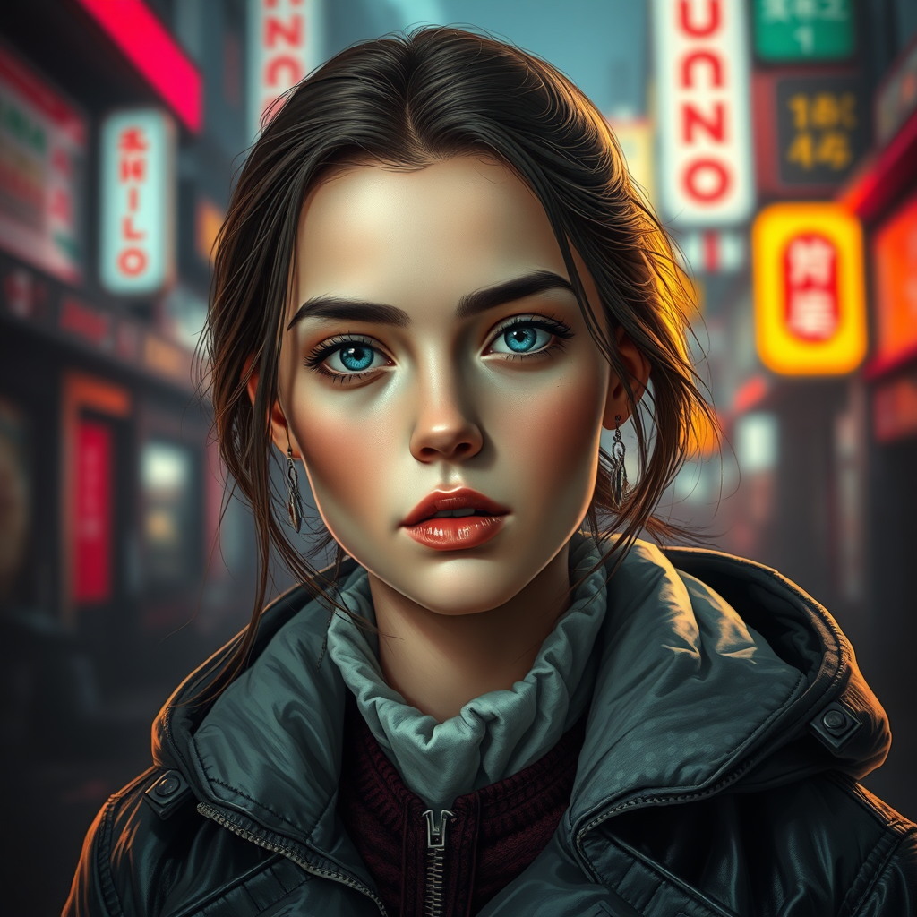 A detailed portrait of a young European girl wearing a storm rain movie jacket coat, inspired by futuristic sci-fi fashion and royal attire. The piece echoes the styles of Ismail Inceoglu, Dragan Bibin, Hans Thoma, Greg Rutkowski, Alexandros Pyromallis, Nekro, and Rene Magritte. She possesses a perfect face with a sharp chin and fine details, enhanced by realistic shading. The setting captures a cyberpunk, Neo-Tokyo vibe with synth-wave aesthetics, featuring low-emission neon lights reminiscent of a Bladerunner movie scene. The artwork blends CGI elements with a 3D feel, avoiding imperfections like poorly drawn hands or deformed features. Her features are clear with no distortion, creating an elegant and futuristic illustration that is both digital and painterly, capturing the neoteric essence of a vibrant, sci-fi world.