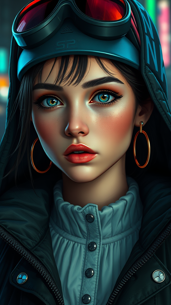 A detailed portrait of a young European girl with striking beauty, clad in a storm-resistant movie jacket and coat, embodying futuristic sci-fi fashion mixed with royal attire. The style is inspired by the works of Ismail Inceoglu and Dragan Bibin, with influences from Hans Thoma, Greg Rutkowski, and Rene Magritte. Her face is perfectly crafted, featuring a sharp chin and fine details, set in a cyberpunk, Neo-Tokyo, and synthwave aesthetic. This scene resembles one from a Blade Runner movie, with a focus on low-emission neon lighting and futuristic allure. The illustration captures realistic shading and fine facial features with elements reminiscent of a 3D doll.