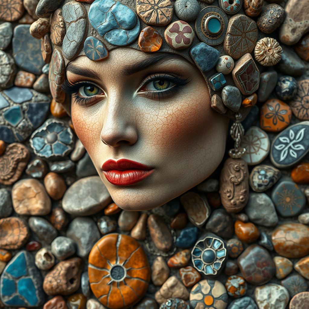 A detailed portrait of an elegant woman layered with a mosaic of stones in various sizes, exhibiting intricate designs and a vibrant palette of blues, reds, oranges, and grays. The texture is diverse, with some stones having a cracked, arid appearance and others appearing polished and smooth, contributing to a visually rich and tactile experience. The organic patterns and contrasting hues blend together to form a mesmerizing and complex visual tapestry.