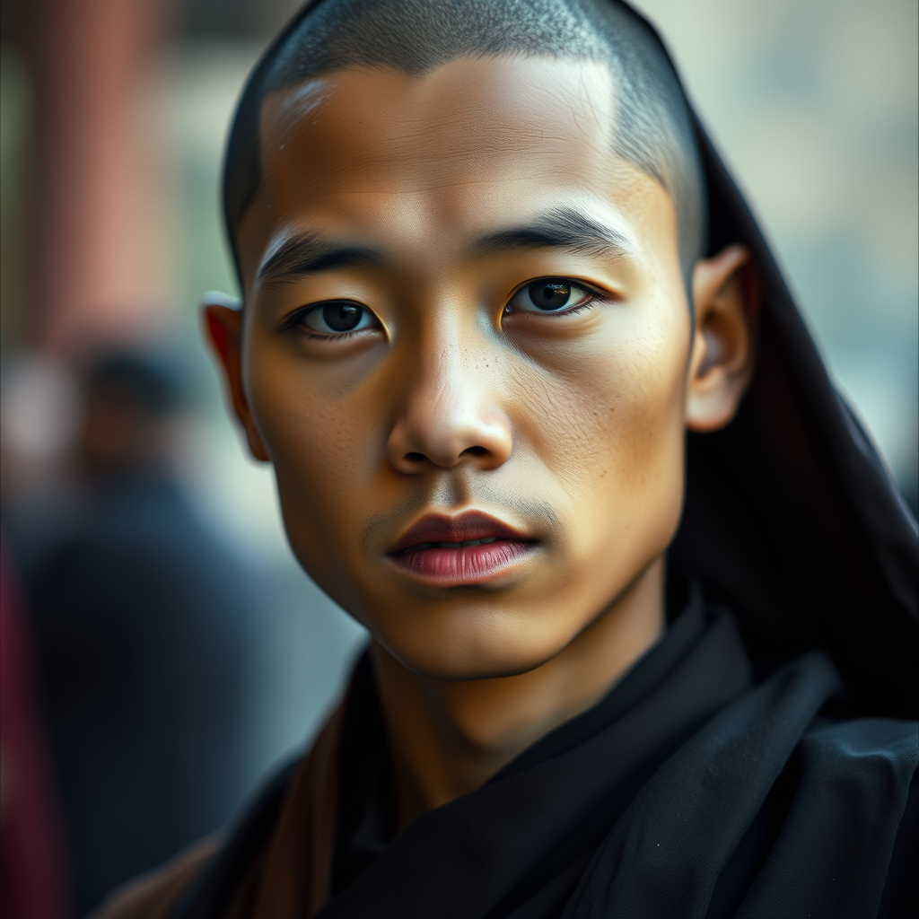 A detailed portrait of an elegant young monk exuding serenity, with a peaceful and radiant demeanor captured in ultra-high definition 8k resolution, enhanced by soft cinematic lighting and shot using a 35mm lens at f1.4 on Fuji color film, incorporating subtle artistic variations for a unique visual interpretation.