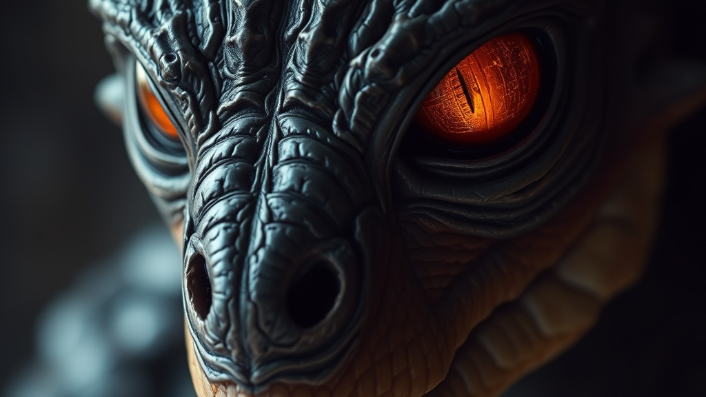 A detailed portrait that captures the essence of profound sorrow, featuring heavily exaggerated dark amber orange reptilian humanoid eyes, its presence is mythical and enigmatic, existing only in the imagination yet resonating deeply with the human form. This creature embodies an unsettling beauty, drawing influence from the iconic art styles of Julie Bell and H. R. Giger, with imaginative modifications that preserve the core concept.