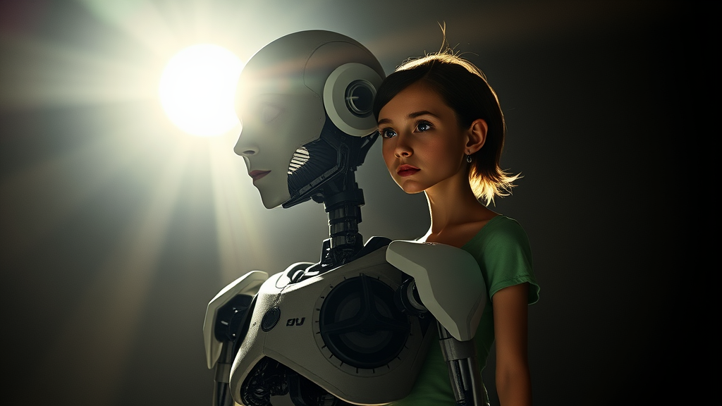 A detailed realistic robot in the style of Chappie stands alongside a minimalist, cropped figure of a girl. The scene is illuminated by a blinding light, casting dramatic shadows across the folded forms. Two figures appear integrated, mimicking a totem with two faces and torsos. Despite the chaotic blend of limbs and facial features, a sense of symmetry emerges amid the distorted, deformed anatomy. The surreal mix of elements conjures a captivating yet unsettling portrait, with hints of overly saturated colors and oddly placed round windows adding a bizarre contrast. Cloudy eyes and lifeless expressions give the composition an eerie atmosphere, capturing a complex narrative of duality and mutation.