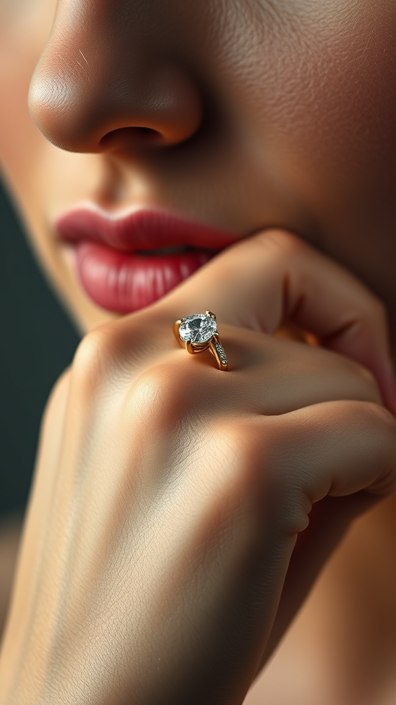 A detailed shot captures an exquisite minimalist ring, a flawless union of gold and diamond. The ring graces the finger of a professional jewelry model, its intricate design elegantly wraps around, enhancing the skin's natural radiance. Taken with a Canon EOS 5D Mark IV paired with a Canon EF 100mm f/2.8L Macro IS USM lens at an aperture of f/8, the image is sharp with the ring set against a beautifully defocused background. Soft studio lighting illuminates the diamond's multifaceted brilliance and the gold's gentle luster, creating a harmonious dance of shadows and highlights that emphasize the ring's sophisticated elegance. This setting accentuates the texture and tone of the skin, capturing an almost ethereal quality — the ring becomes a masterpiece of subtle yet striking beauty. The sense of difference is apparent through an exaggerated focus on the ring, while the whole face and expression fade elegantly into abstraction, allowing the viewer to be drawn into the ring's enchanting allure.