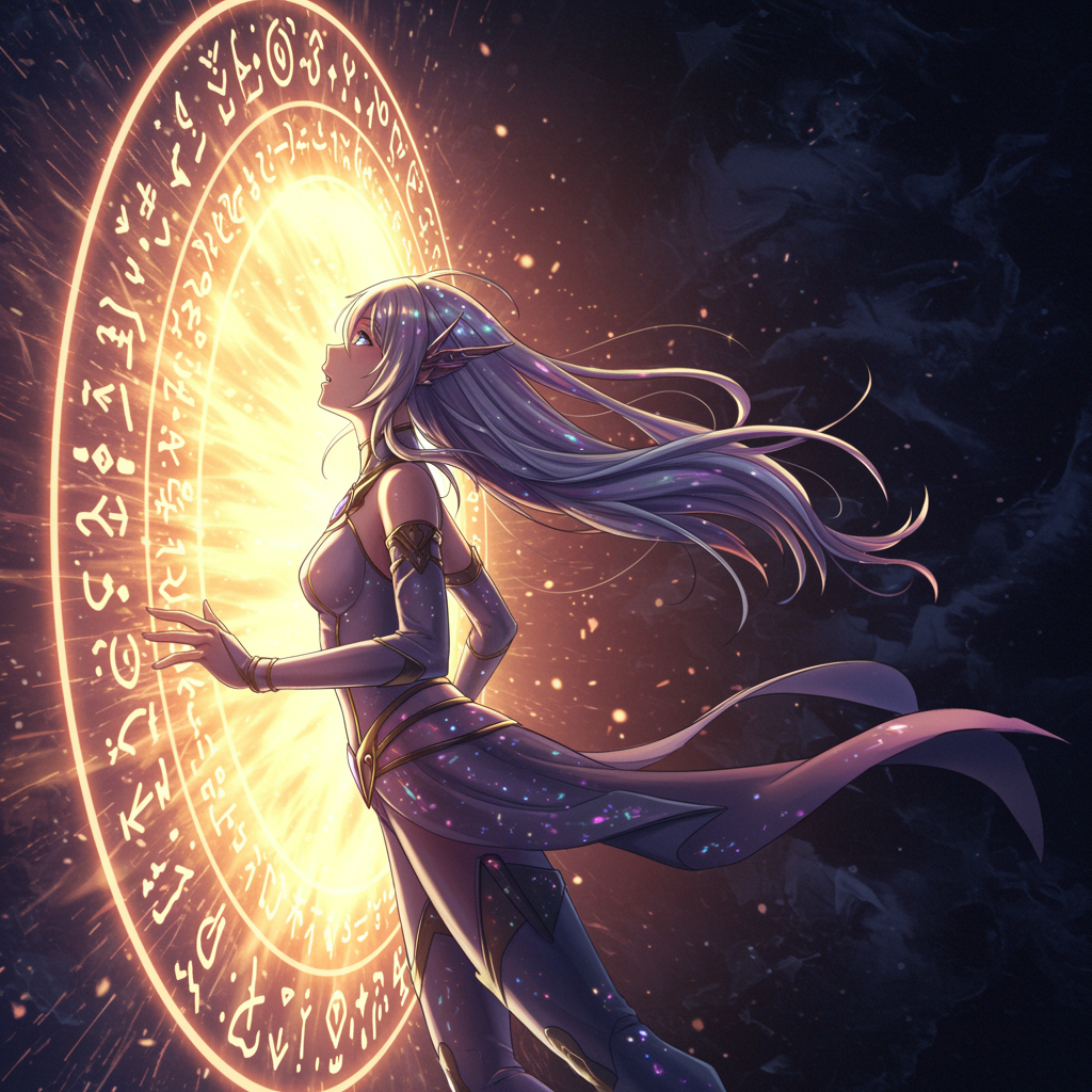 A detailed side view of a female anime-style character poised to step through a luminous, otherworldly portal that bridges to the real world, her features captivated in a moment of anticipation and awe. The scene captures the intricate design of her attire, shimmering with an ethereal glow that mirrors the portal's radiant energy, casting a soft light on her expressive face. Her hair flows elegantly, blending seamlessly with the swirling magic, creating a sense of motion and depth. The portal itself is a complex tapestry of colors and symbols, nearly photorealistic in its vividness, contrasted by the character's vibrant anime style, all rendered in breathtaking 8k resolution to emphasize the minute details and evoke a palpable sense of wonder and adventure in a 3:2 aspect ratio.