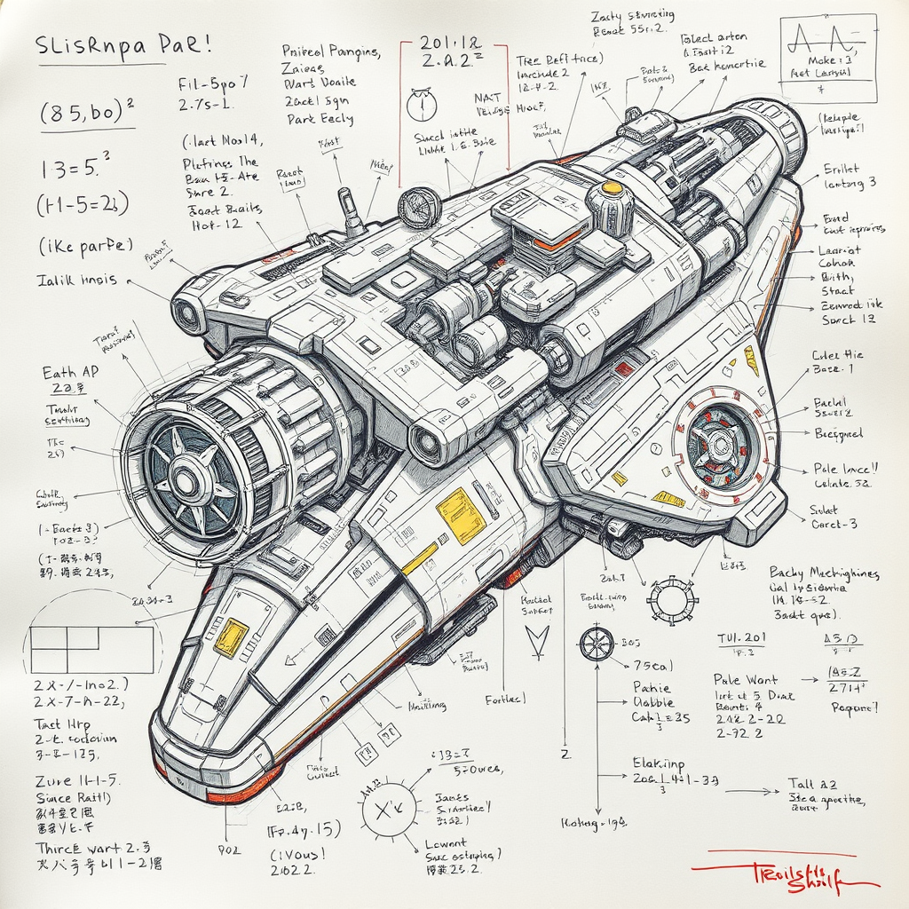 A detailed sketch of a futuristic sci-fi colossal spacecraft featuring intricate warp engines, filled with complex formulas and annotations throughout; the schematic broken down by parts, incorporating the elegance of the golden ratio with creatively embellished details. The art style blends the rich, textured strokes of an acrylic palette knife with the whimsical and vibrant influences of Makoto Shinkai, Studio Ghibli, Genshin Impact, and artists like James Gilleard, Greg Rutkowski, and Chiho Aoshima. The entire design exudes an imaginative allure, reminiscent of trending styles on pixiv fanbox, offering a harmonious fusion of innovation and artistry.