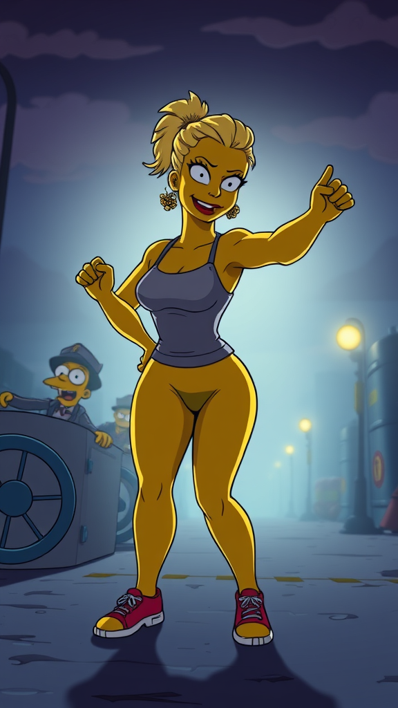 A detailed still image of a character resembling Margot Robbie in the style of The Simpsons by Matt Groening, full-body view, captured in an action pose that conveys energy and dynamism. The scene is cinematic and epic, featuring a background that complements the character's personality and setting. Cinematic rim lighting enhances the silhouette, with skillful light shading adding depth. The color grading is vivid and balanced, creating a colorful and engaging atmosphere. The artwork is highly detailed, rendered in 4k quality, showcasing the vibrant color palette and intricate design elements that define the iconic animation style. The composition is set in a 2:3 aspect ratio, reflecting the dynamic and storytelling-centric approach of classic animation design.