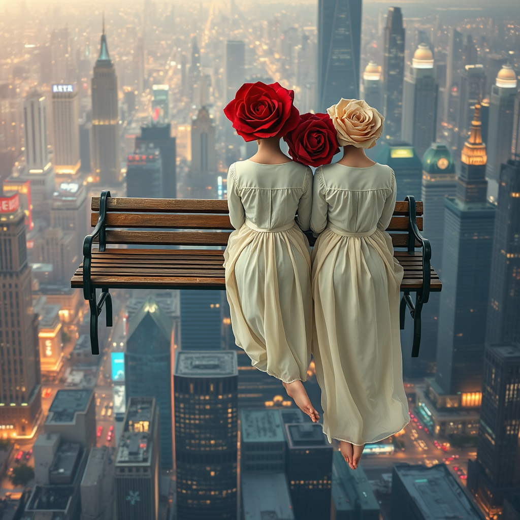 A detailed surrealistic portrait of a bench floating over a fluid, bustling cityscape, where three rose-headed women are seated. One has a crimson rose head, while the others have ivory rose heads. The high-resolution image captures the ethereal harmony of nature and urban life, with subtle modifications like a slight glow around the roses and reflections of city lights dancing on the liquid surface below.