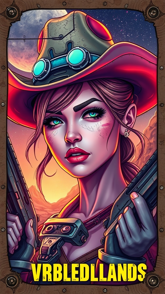 A detailed trading card frame features a female space cowboy wearing a distinct cowboy hat. Her skin is highly detailed, adorned with stunning gradient colors that capture the eye. Set against an alien planet backdrop with a galaxy theme, the scene embraces a Borderlands style, rich with detail. The character possesses a dirty face, highlighted with cel shading and enhanced by an HDR effect. She wears earrings, accompanied by volumetric atmosphere wires that add depth to the visuals. While her face is the focal point, the scene is enriched with absurdres quality, exhibiting sharp clarity without text or artifacts. Her expression is intense, adding to her dynamic presence. Equipped with futuristic guns and pistols, her portrayal is both fearless and captivating, blending seamlessly into the detailed background. The composition remains free from any watermarks, signatures, or titles, ensuring a pristine viewing experience.
