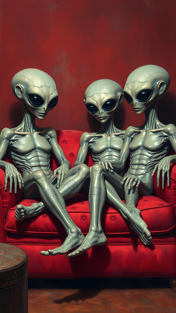 A detailed trompe-l'œil painting depicts four extraterrestrials relaxing on a plush sofa, capturing the illusionistic intricacies and presenting humanoid anatomy with precision. The composition is enriched with deep crimson hues and gentle splashes of light blue, reminiscent of American prints spanning from 1880 to 1950. The setting feels both nostalgic and otherworldly, merging vintage aesthetics with cosmic imagination.