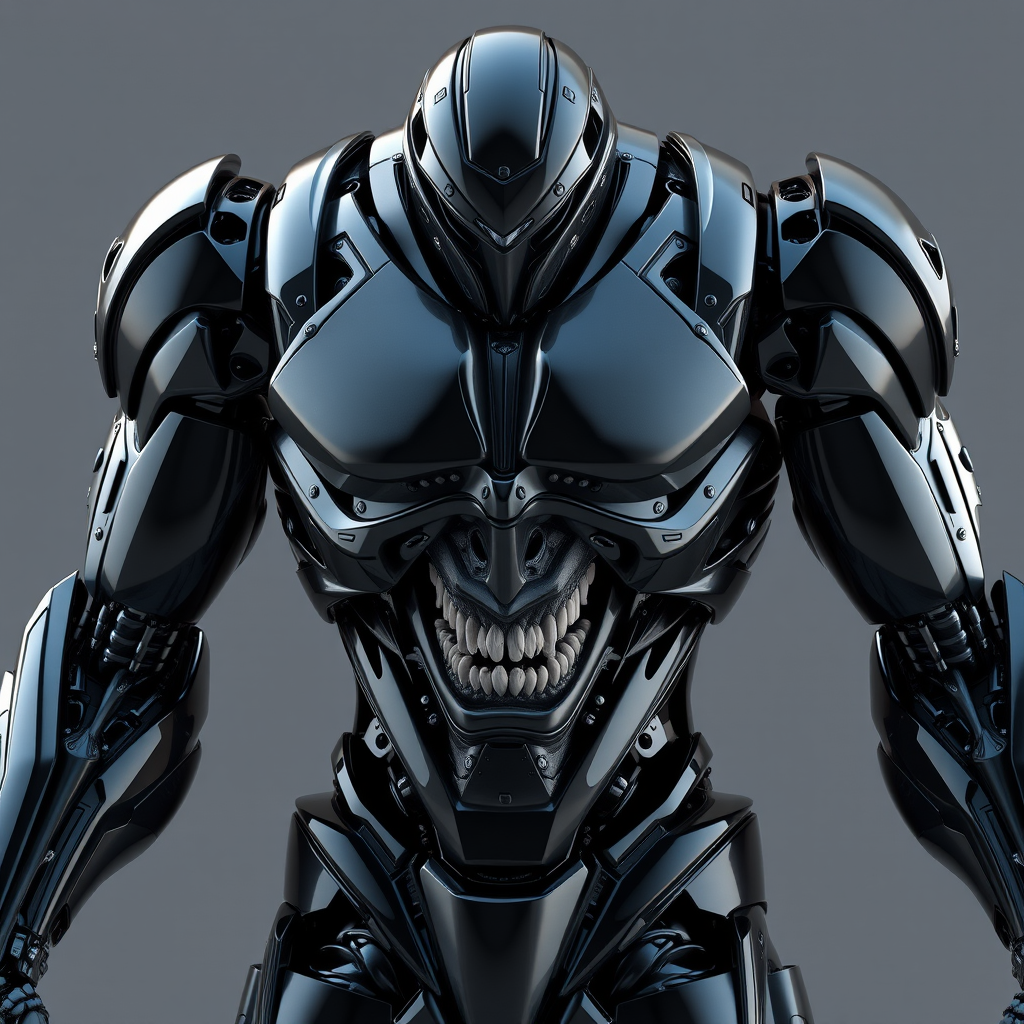 A detailed, ultra-realistic 3D render of a charismatic, muscular villainous humanoid robot, featuring sharp lines and dark reflective materials. The robot showcases intricate tiny details and realistic natural textures, with a high level of reflections enhancing its menacing appeal.