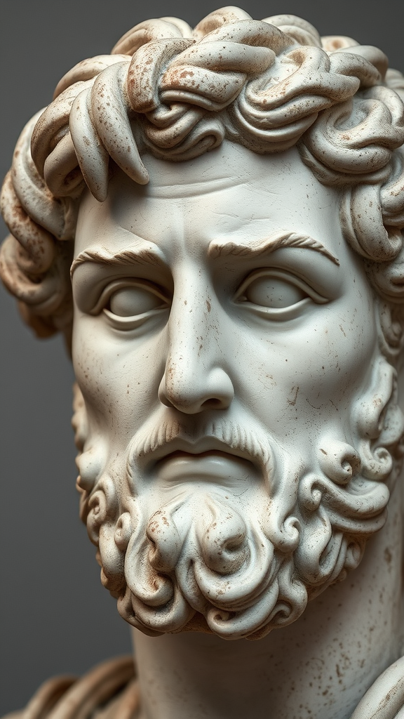 A detailed view of a Roman sculpture depicting the face of Emperor Hadrian, set against a soft grey backdrop, capturing the intricate details of his expression and textured features, infused with subtle artistic enhancements to bring a timeless quality to the portrayal.